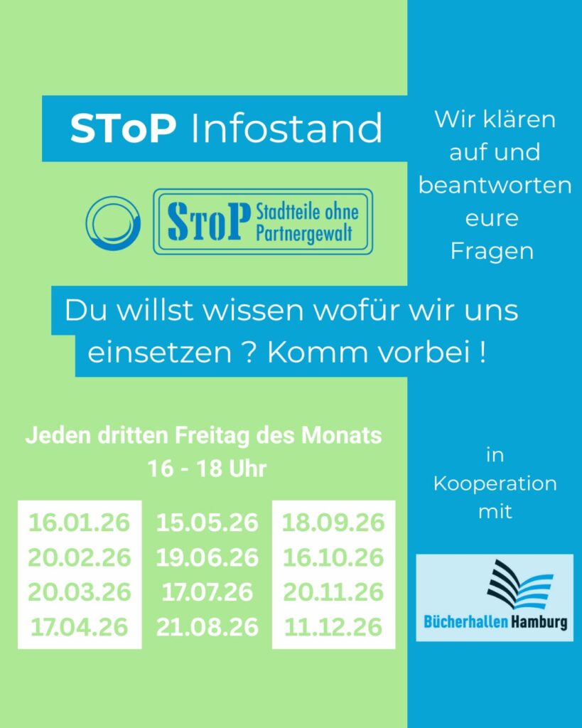 Wenn du mehr über StoP- Stadtteile ohne Partnergewalt erfahren möchtest, komme gerne zu unserem Infostand in der Bücherhalle Harburg