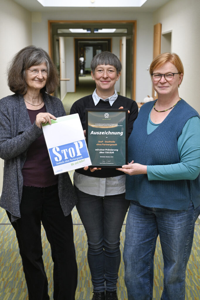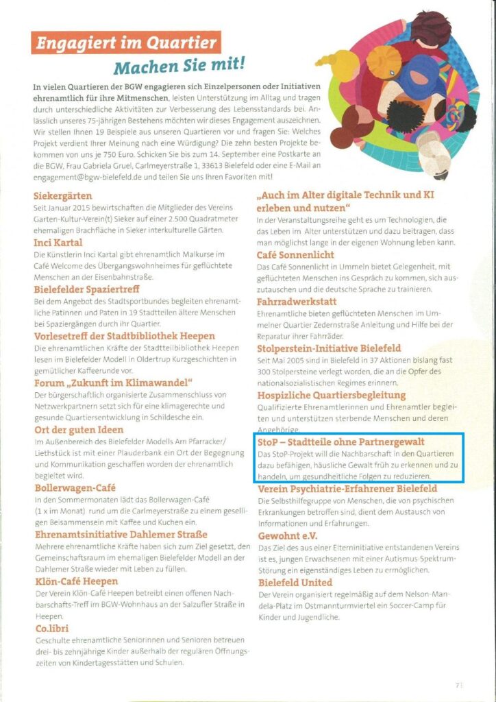 Anlässlich Ihres 75-jährigen Bestehens zeichnet die BGW das Engagement von ehrenamtlich engagierten Einzelpersonen und Initiativen in Ihren Quartieren aus. StoP – Stadtteile ohne Partnergewalt ist ein Projekt von 10 besten Projekten, für welches abgestimmt wurde. Wir freuen uns sehr über die zahlreichen StoP Stimmen und nehmen die Prämierung über 750 € mit großem Dank an.