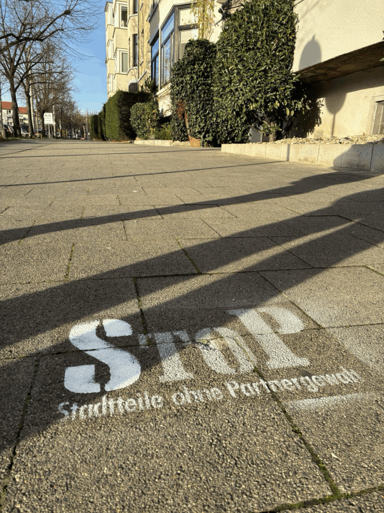 Heute hat sich die StoP-Aktiven-Gruppe des westlichen Ringgebiets getroffen, um mit Sprühkreide "StoP sichtbar zu machen". Rund um den Frankfurter Platz findet ihr das gesprühte Logo.